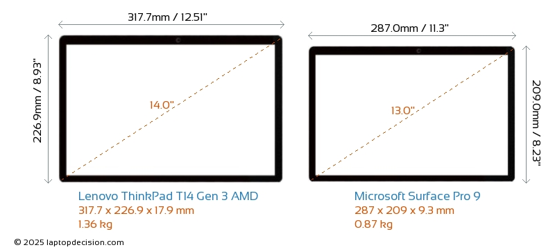 Thunderbolt Surface Pro 9 is equipped with Thunderbolt 4 port. ThinkPad T14 Gen 3 AMD does not have Thunderbolt port.