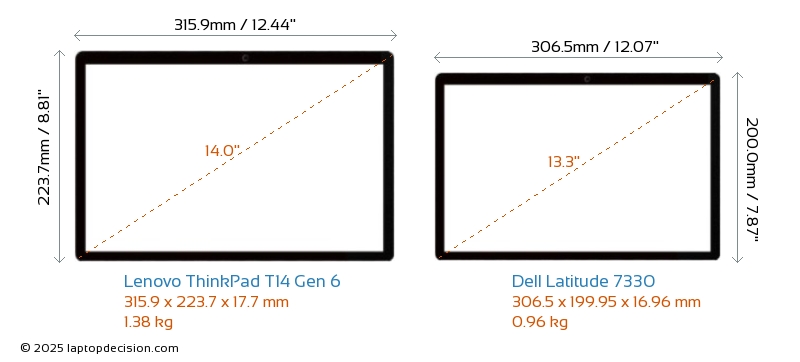 HDMIBoth ThinkPad T14 Gen 6 and Latitude 7330 feature an HDMI port. ThinkPad T14 Gen 6 offers 1x HDMI 2.1, while Latitude 7330 offers 1x HDMI 2.0.