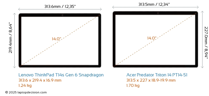 USBBoth ThinkPad T14s Gen 6 Snapdragon and Predator Triton 14 PT14-51 have USB-A ports. ThinkPad T14s Gen 6 Snapdragon has 2x USB 3.2 USB-A ports, while Predator Triton 14 PT14-51 has 3x USB 3.2 USB-A ports.Both ThinkPad T14s Gen 6 Snapdragon and Predator Triton 14 PT14-51 have USB Type-C ports. ThinkPad T14s Gen 6 Snapdragon has 2x USB 4.0 USB Type-C ports, while Predator Triton 14 PT14-51 has 1x USB 3.2 USB Type-C ports.