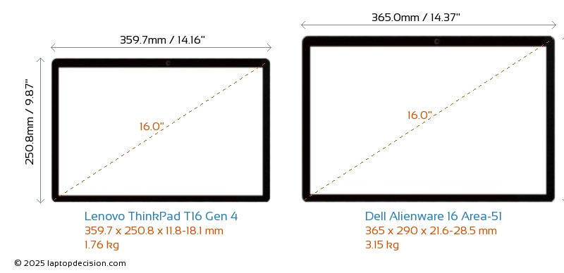 ThunderboltBoth ThinkPad T16 Gen 4 and Alienware 16 Area-51 feature Thunderbolt ports. ThinkPad T16 Gen 4 has Thunderbolt 4, while Alienware 16 Area-51 has Thunderbolt 5.
