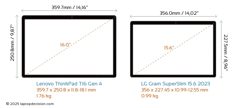HDMI ThinkPad T16 Gen 4 features an HDMI port (1x HDMI 2.1) for connecting to external monitors. Gram SuperSlim 15.6 2023 does not have an HDMI port.
