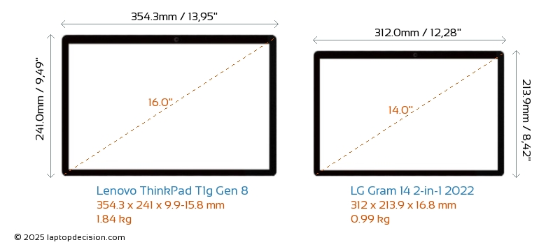 ThunderboltBoth ThinkPad T1g Gen 8 and Gram 14 2-in-1 2022 feature Thunderbolt ports. ThinkPad T1g Gen 8 has Thunderbolt 5, while Gram 14 2-in-1 2022 has Thunderbolt 4.