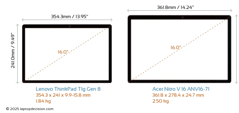 USBBoth ThinkPad T1g Gen 8 and Nitro V 16 ANV16-71 have USB-A ports. ThinkPad T1g Gen 8 has 1x USB 3.2 USB-A ports, while Nitro V 16 ANV16-71 has 2x USB 3.2 USB-A ports.Both ThinkPad T1g Gen 8 and Nitro V 16 ANV16-71 have USB Type-C ports. ThinkPad T1g Gen 8 has 3x USB 4.0 USB Type-C ports, while Nitro V 16 ANV16-71 has 1x USB 4.0 USB Type-C ports.