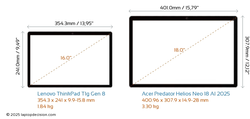 Wifi ThinkPad T1g Gen 8 features a more advanced Wi-Fi standard v7, providing faster and more reliable wireless connections compared to Predator Helios Neo 18 AI 2025 (v6E).