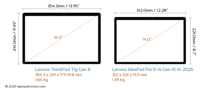USBBoth ThinkPad T1g Gen 8 and IdeaPad Pro 5i 14 Gen 10 14 2025 have USB-A ports. ThinkPad T1g Gen 8 has 1x USB 3.2 USB-A ports, while IdeaPad Pro 5i 14 Gen 10 14 2025 has 2x USB 3.2 USB-A ports.Both ThinkPad T1g Gen 8 and IdeaPad Pro 5i 14 Gen 10 14 2025 have USB Type-C ports. ThinkPad T1g Gen 8 has 3x USB 4.0 USB Type-C ports, while IdeaPad Pro 5i 14 Gen 10 14 2025 has 2x USB 4.0 USB Type-C ports.