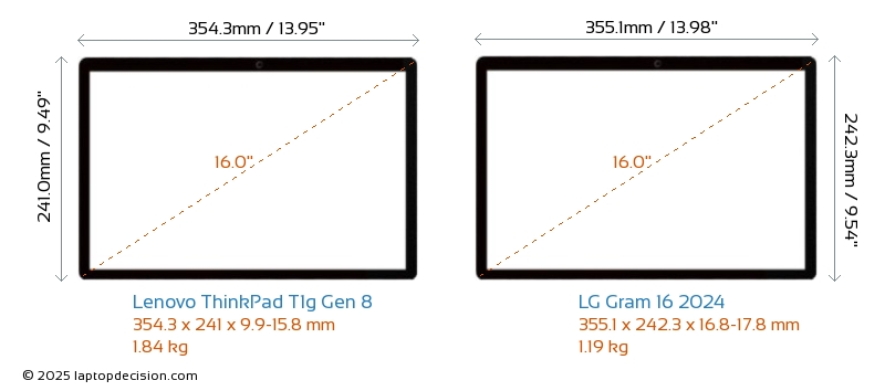 Wifi ThinkPad T1g Gen 8 features a more advanced Wi-Fi standard v7, providing faster and more reliable wireless connections compared to Gram 16 2024 (v6E).