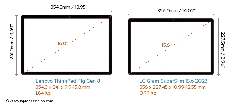 Wifi ThinkPad T1g Gen 8 features a more advanced Wi-Fi standard v7, providing faster and more reliable wireless connections compared to Gram SuperSlim 15.6 2023 (v6E).