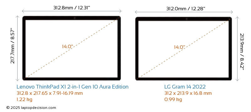 HDMIBoth ThinkPad X1 2-in-1 Gen 10 Aura Edition and Gram 14 2022 feature an HDMI port. ThinkPad X1 2-in-1 Gen 10 Aura Edition offers 1x HDMI 2.1, while Gram 14 2022 offers 1x HDMI 2.0.