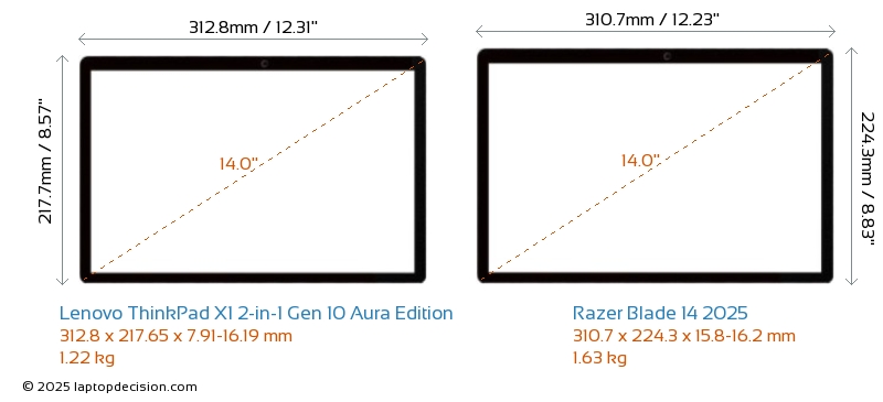 USBBoth ThinkPad X1 2-in-1 Gen 10 Aura Edition and Blade 14 2025 feature 2x USB 3.2 USB-A ports.Both ThinkPad X1 2-in-1 Gen 10 Aura Edition and Blade 14 2025 feature 2x USB 4.0 USB Type-C ports.