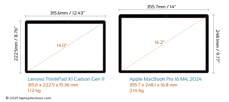 HDMIBoth ThinkPad X1 Carbon Gen 11 and MacBook Pro 16 M4, 2024 feature an HDMI port. ThinkPad X1 Carbon Gen 11 offers 1x HDMI 2.0, while MacBook Pro 16 M4, 2024 offers 1x HDMI 2.1.