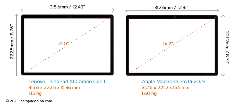 HDMIBoth ThinkPad X1 Carbon Gen 11 and MacBook Pro 14 2023 feature an HDMI port. ThinkPad X1 Carbon Gen 11 offers 1x HDMI 2.0, while MacBook Pro 14 2023 offers 1x HDMI 2.1.
