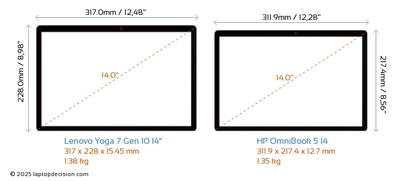 HDMI Yoga 7 Gen 10 14" features an HDMI port (1x HDMI 2.1) for connecting to external monitors. OmniBook 5 14 does not have an HDMI port.