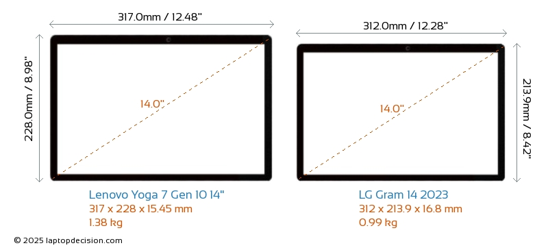 HDMIBoth Yoga 7 Gen 10 14" and Gram 14 2023 feature an HDMI port. Yoga 7 Gen 10 14" offers 1x HDMI 2.1, while Gram 14 2023 offers 1x HDMI 2.0.