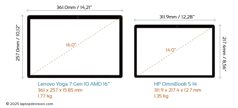 HDMI Yoga 7 Gen 10 AMD 16" features an HDMI port (1x HDMI 1.4) for connecting to external monitors. OmniBook 5 14 does not have an HDMI port.