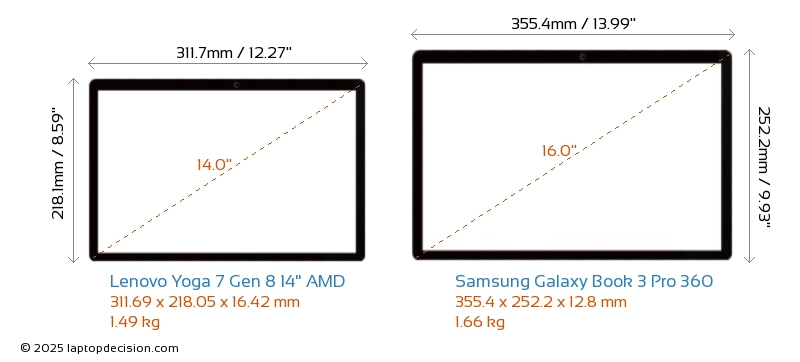 HDMIBoth Yoga 7 Gen 8 14" AMD and Galaxy Book 3 Pro 360 feature an HDMI port (1x HDMI 1.4) for connecting to external monitors.