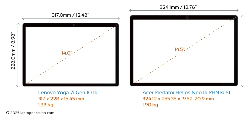 USBBoth Yoga 7i Gen 10 14" and Predator Helios Neo 14 PHN14-51 have USB-A ports. Yoga 7i Gen 10 14" has 1x USB 3.2 USB-A ports, while Predator Helios Neo 14 PHN14-51 has 2x USB 3.2 USB-A ports.Both Yoga 7i Gen 10 14" and Predator Helios Neo 14 PHN14-51 have USB Type-C ports. Yoga 7i Gen 10 14" has 2x USB 4.0 USB Type-C ports, while Predator Helios Neo 14 PHN14-51 has 2x USB 3.2 USB Type-C ports.