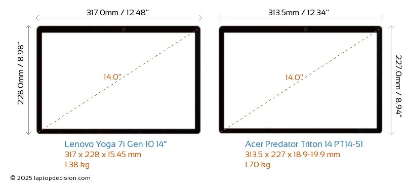 Wifi Yoga 7i Gen 10 14" features a more advanced Wi-Fi standard v7, providing faster and more reliable wireless connections compared to Predator Triton 14 PT14-51 (v6E).