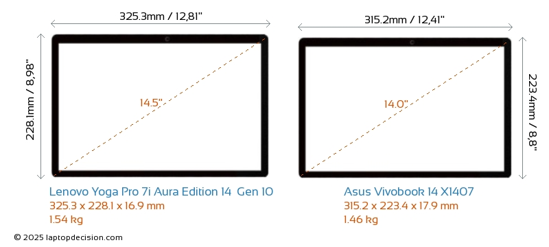 HDMIBoth Yoga Pro 7i Aura Edition 14 Gen 10 and Vivobook 14 X1407 feature an HDMI port. Yoga Pro 7i Aura Edition 14 Gen 10 offers 1x HDMI 2.1, while Vivobook 14 X1407 offers 1x HDMI 1.4.