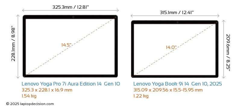 USB Yoga Pro 7i Aura Edition 14 Gen 10 is equipped with 2x USB 3.2 USB-A ports. Yoga Book 9i 14 Gen 10, 2025 does not have USB-A ports.Both Yoga Pro 7i Aura Edition 14 Gen 10 and Yoga Book 9i 14 Gen 10, 2025 have USB Type-C ports. Yoga Pro 7i Aura Edition 14 Gen 10 has 2x USB 4.0 USB Type-C ports, while Yoga Book 9i 14 Gen 10, 2025 has 3x USB 4.0 USB Type-C ports.