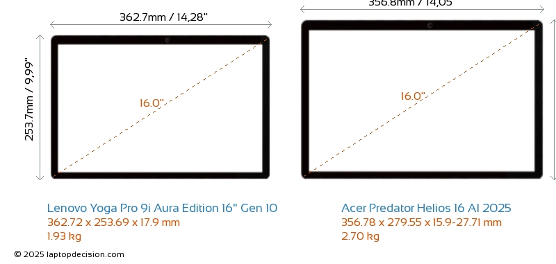 HDMIBoth Yoga Pro 9i Aura Edition 16" Gen 10 and Predator Helios 16 AI 2025 feature an HDMI port (1x HDMI 2.1) for connecting to external monitors.
