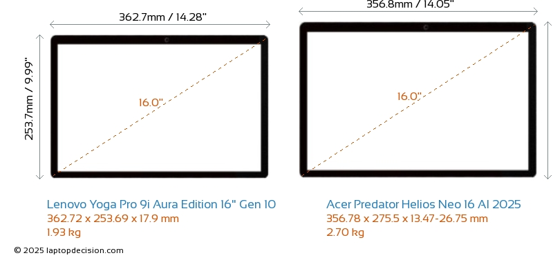 HDMIBoth Yoga Pro 9i Aura Edition 16" Gen 10 and Predator Helios Neo 16 AI 2025 feature an HDMI port (1x HDMI 2.1) for connecting to external monitors.