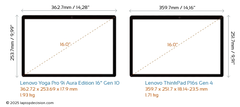 ThunderboltBoth Yoga Pro 9i Aura Edition 16" Gen 10 and ThinkPad P16s Gen 4 are equipped with Thunderbolt 4 ports.
