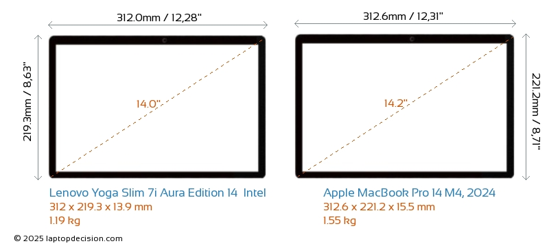 USB Yoga Slim 7i Aura Edition 14 Intel is equipped with 1x USB 3.2 USB-A ports. MacBook Pro 14 M4, 2024 does not have USB-A ports.Both Yoga Slim 7i Aura Edition 14 Intel and MacBook Pro 14 M4, 2024 have USB Type-C ports. Yoga Slim 7i Aura Edition 14 Intel has 2x USB 4.0 USB Type-C ports, while MacBook Pro 14 M4, 2024 has 3x USB 4.0 USB Type-C ports.
