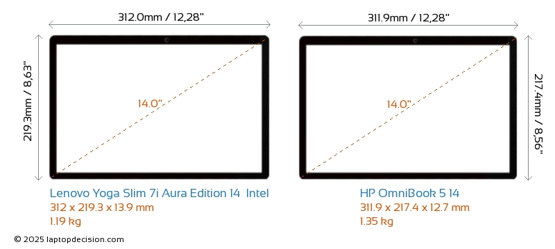 HDMI Yoga Slim 7i Aura Edition 14 Intel features an HDMI port (1x HDMI 2.1) for connecting to external monitors. OmniBook 5 14 does not have an HDMI port.
