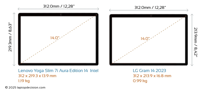 HDMIBoth Yoga Slim 7i Aura Edition 14 Intel and Gram 14 2023 feature an HDMI port. Yoga Slim 7i Aura Edition 14 Intel offers 1x HDMI 2.1, while Gram 14 2023 offers 1x HDMI 2.0.