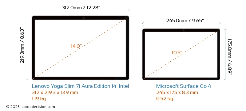 HDMI Yoga Slim 7i Aura Edition 14 Intel features an HDMI port (1x HDMI 2.1) for connecting to external monitors. Surface Go 4 does not have an HDMI port.