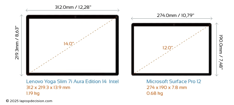 HDMI Yoga Slim 7i Aura Edition 14 Intel features an HDMI port (1x HDMI 2.1) for connecting to external monitors. Surface Pro 12 does not have an HDMI port.