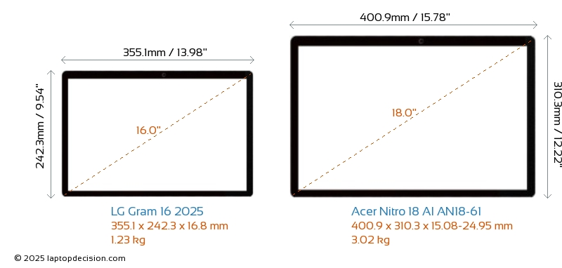 HDMIBoth Gram 16 2025 and Nitro 18 AI AN18-61 feature an HDMI port (1x HDMI 2.1) for connecting to external monitors.