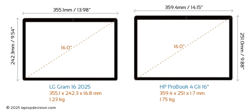 HDMIBoth Gram 16 2025 and ProBook 4 G1i 16" feature an HDMI port (1x HDMI 2.1) for connecting to external monitors.
