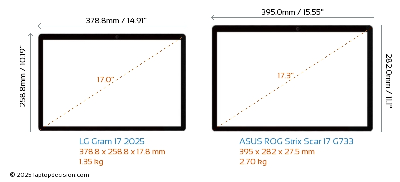 HDMIBoth Gram 17 2025 and ROG Strix Scar 17 G733 feature an HDMI port. Gram 17 2025 offers 1x HDMI 2.1, while ROG Strix Scar 17 G733 offers 1x HDMI 2.0.
