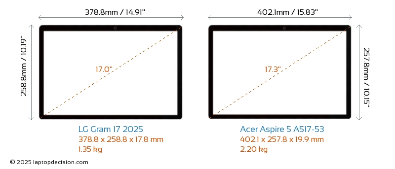 HDMIBoth Gram 17 2025 and Aspire 5 A517-53 feature an HDMI port. Gram 17 2025 offers 1x HDMI 2.1, while Aspire 5 A517-53 offers 1x HDMI 2.0.