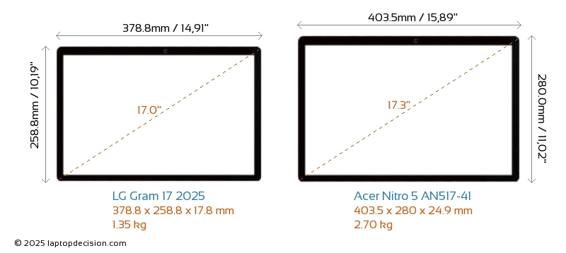 HDMIBoth Gram 17 2025 and Nitro 5 AN517-41 feature an HDMI port. Gram 17 2025 offers 1x HDMI 2.1, while Nitro 5 AN517-41 offers 1x HDMI 2.0.
