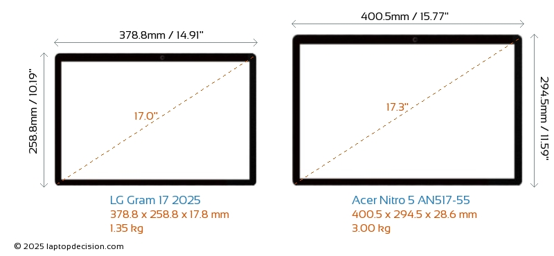 USBBoth Gram 17 2025 and Nitro 5 AN517-55 have USB-A ports. Gram 17 2025 has 2x USB 3.2 USB-A ports, while Nitro 5 AN517-55 has 3x USB 3.2 USB-A ports.Both Gram 17 2025 and Nitro 5 AN517-55 have USB Type-C ports. Gram 17 2025 has 2x USB 4.0 USB Type-C ports, while Nitro 5 AN517-55 has 1x USB 3.2 USB Type-C ports.