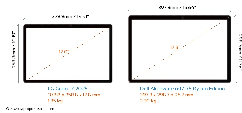 Audio JackBoth Gram 17 2025 and Alienware m17 R5 Ryzen Edition are equipped with a 3.5mm Audio Jack, providing seamless connection to headphones and speakers.