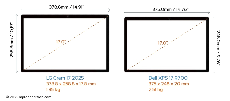 HDMI Gram 17 2025 features an HDMI port (1x HDMI 2.1) for connecting to external monitors. XPS 17 9700 does not have an HDMI port.