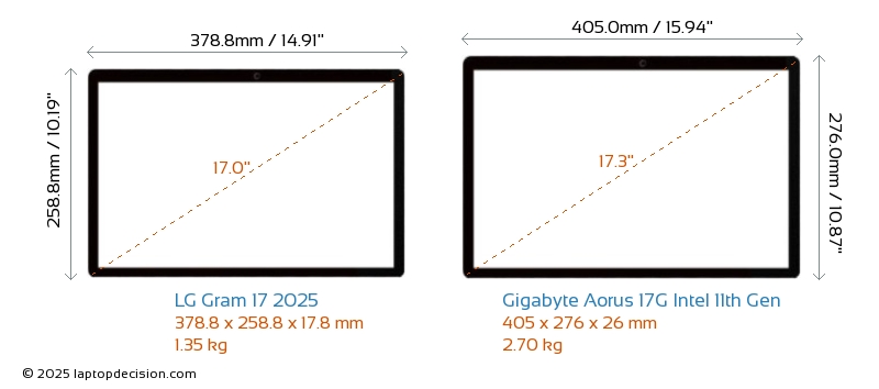 Wifi Gram 17 2025 features a more advanced Wi-Fi standard v7, providing faster and more reliable wireless connections compared to Aorus 17G Intel 11th Gen (v6).