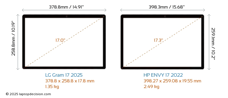 Wifi Gram 17 2025 features a more advanced Wi-Fi standard v7, providing faster and more reliable wireless connections compared to ENVY 17 2022 (v6E).