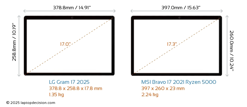 HDMIBoth Gram 17 2025 and Bravo 17 2021 Ryzen 5000 feature an HDMI port. Gram 17 2025 offers 1x HDMI 2.1, while Bravo 17 2021 Ryzen 5000 offers 1x HDMI 2.0.