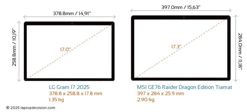 Wifi Gram 17 2025 features a more advanced Wi-Fi standard v7, providing faster and more reliable wireless connections compared to GE76 Raider Dragon Edition Tiamat (v6).