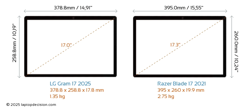 HDMIBoth Gram 17 2025 and Blade 17 2021 feature an HDMI port (1x HDMI 2.1) for connecting to external monitors.