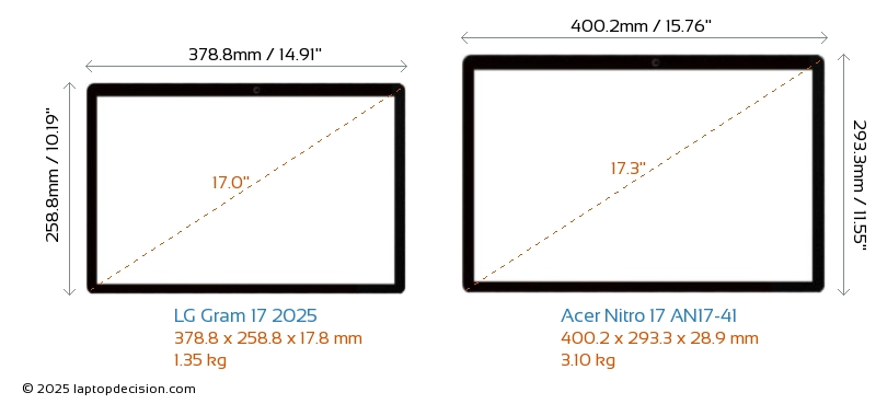 Wifi Gram 17 2025 features a more advanced Wi-Fi standard v7, providing faster and more reliable wireless connections compared to Nitro 17 AN17-41 (v6E).