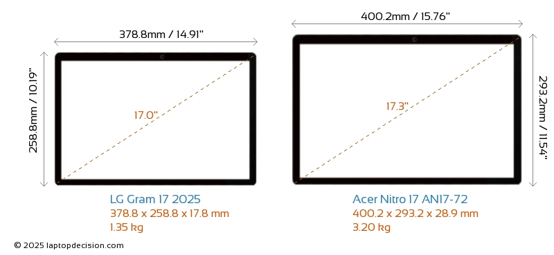 Wifi Gram 17 2025 features a more advanced Wi-Fi standard v7, providing faster and more reliable wireless connections compared to Nitro 17 AN17-72 (v6E).