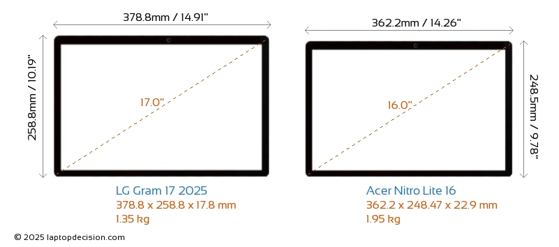 HDMIBoth Gram 17 2025 and Nitro Lite 16 feature an HDMI port (1x HDMI 2.1) for connecting to external monitors.