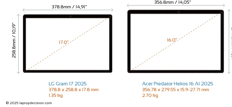 HDMIBoth Gram 17 2025 and Predator Helios 16 AI 2025 feature an HDMI port (1x HDMI 2.1) for connecting to external monitors.