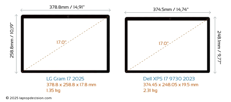 HDMI Gram 17 2025 features an HDMI port (1x HDMI 2.1) for connecting to external monitors. XPS 17 9730 2023 does not have an HDMI port.