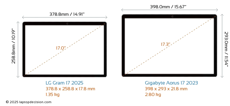 HDMIBoth Gram 17 2025 and Aorus 17 2023 feature an HDMI port (1x HDMI 2.1) for connecting to external monitors.